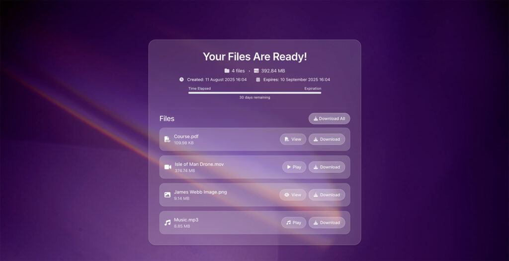 - Inline Video Previews: Recipients get an embedded player on the download page. They can scrub, play, and pause without downloading, which is huge for quick approvals.