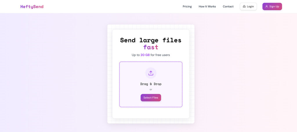 Start by heading to HeftySend.com. The site is clean and loads in seconds, with a big drag-and-drop zone front and center.
